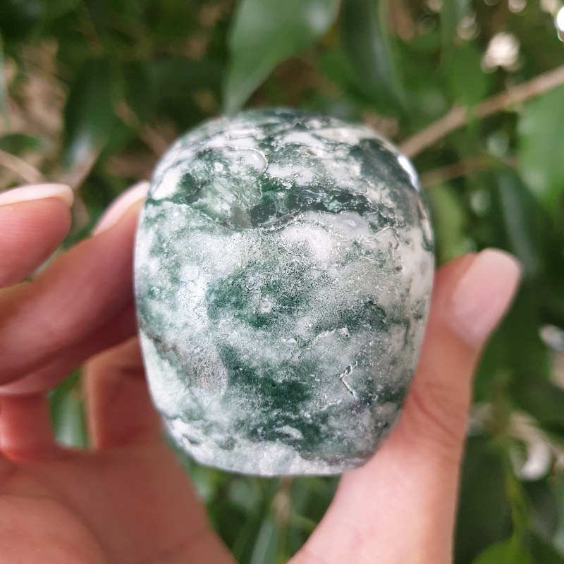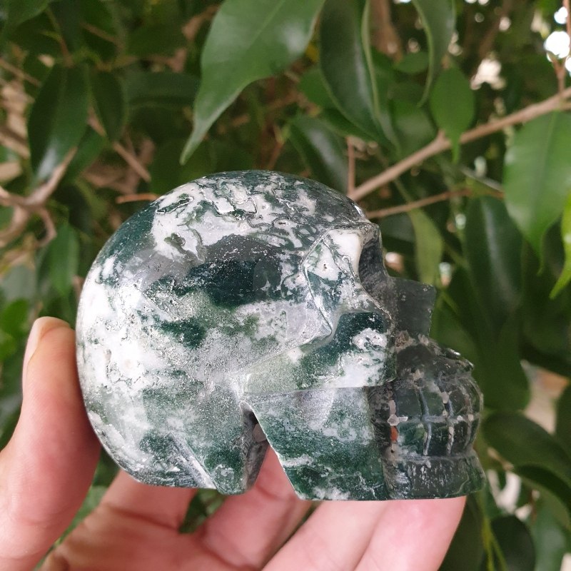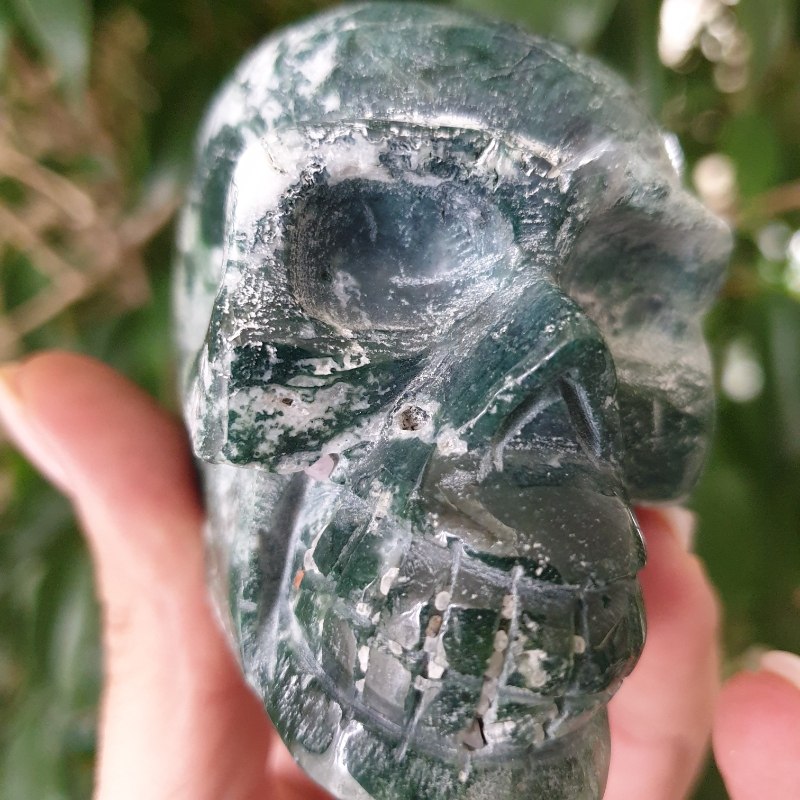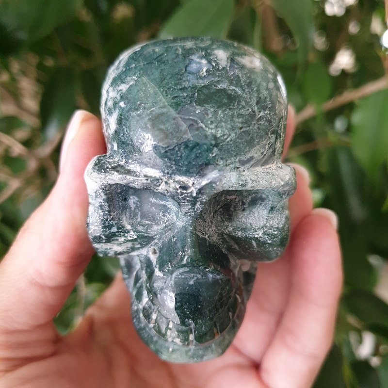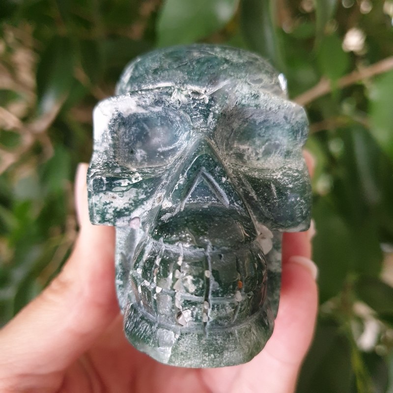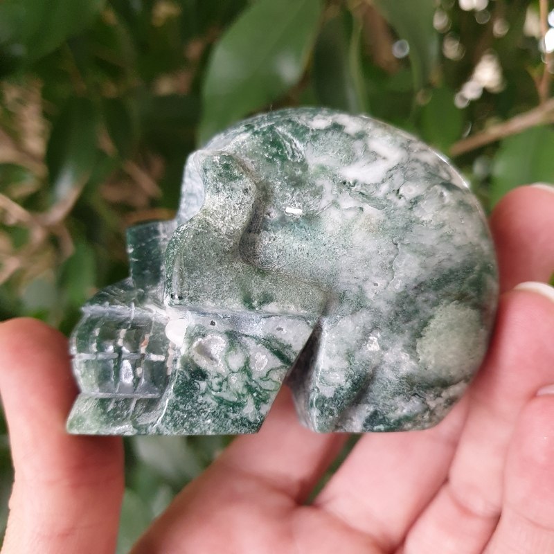 Faragott, moha achát ásvány koponya. 7 x 4,5 cm