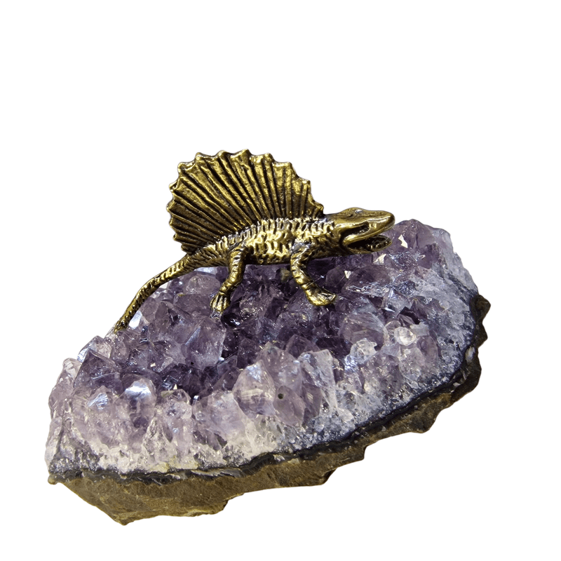 Ez a különleges dekorációs tárgy valódi ametiszt kristály drúzából és egy aprólékosan kidolgozott, bronzszínű dinoszaurusz figurából áll. Az ametiszt lila árnyalatai természetes szépséget sugároznak, míg a fényes dínófigura játékosságot és karaktert visz a kompozícióba. Tökéletes választás ajándéknak, íróasztal díszének vagy ásványgyűjtemény különleges darabjának.
