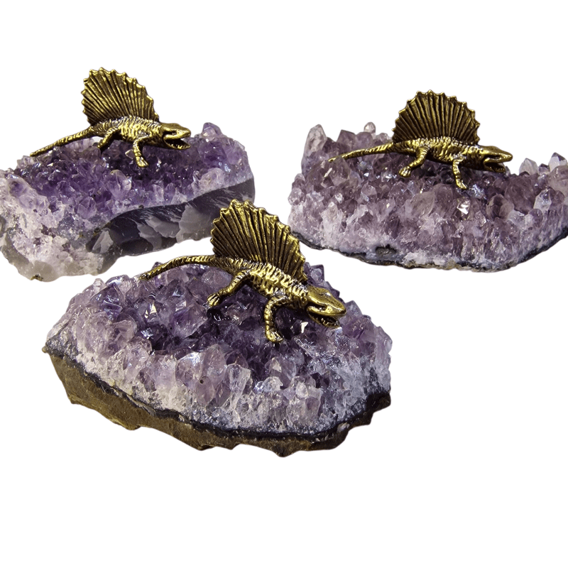 Ametiszt drúza arany dinoszaurusszal – egyedi kézműves ásványdekoráció