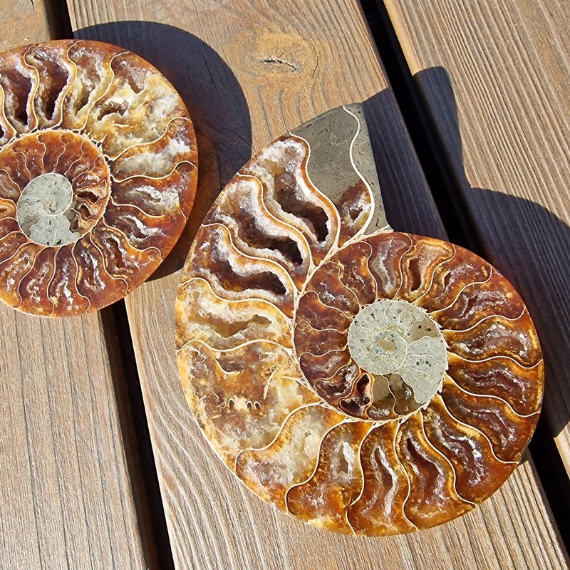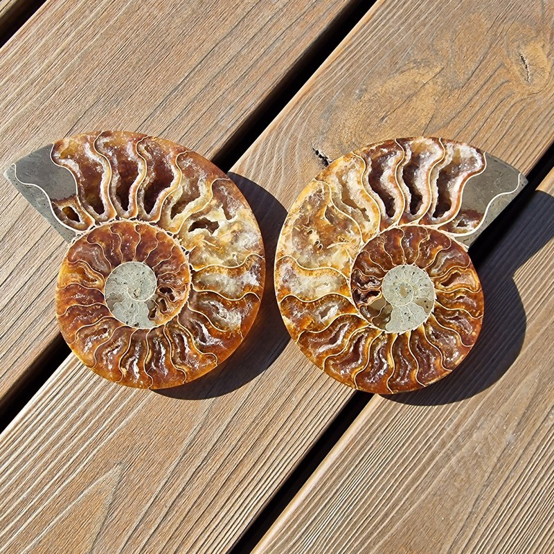 Fosszílizálódott ammonitesz pár Madagaszkárról. Szépen kikristályosodott kamrákkal.