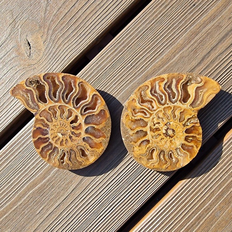 Fosszílizálódott ammonitesz pár Madagaszkárról. Szépen kikristályosodott kamrákkal.