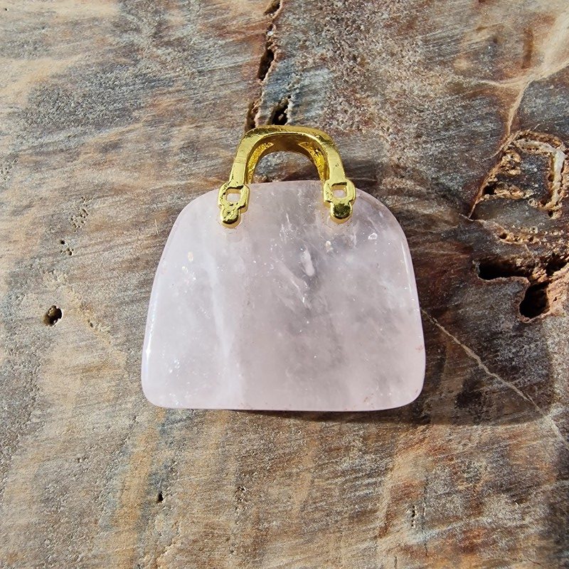 Rózsakvarc ásványból faragott táska. Medálként is hordható.