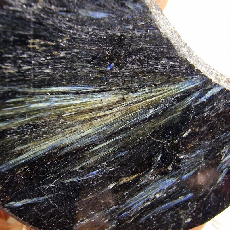 Szín: fekete alapon kékes és aranyló kristályzárványok