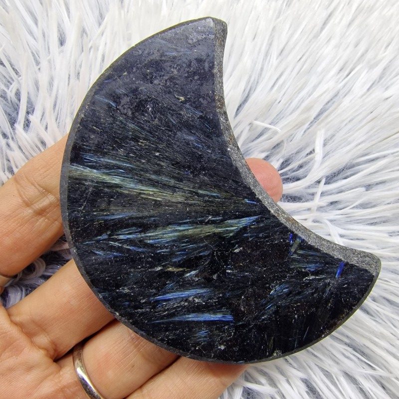 Ez a különleges, félhold alakúra csiszolt asztrofillit ásvány igazi ékköve lehet otthonodnak vagy gyűjteményednek. A sötét alapszínben megcsillanó aranyló és kékes árnyalatok a természet egyedi alkotásait idézik. Az asztrofillit egy ritka, spirituálisan is nagyra becsült ásvány, amely különösen népszerű a kristályok iránt érdeklődők és a meditáció gyakorlói körében.