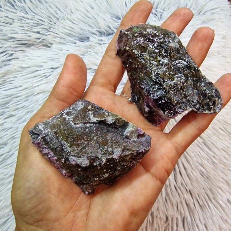 Ez a nyers atlantiszit ásványcsomag két különleges, természetes követ tartalmaz, amelyek egyik oldala finoman csiszolt, míg a másik megőrzi a kő eredeti, nyers formáját. Az atlantiszit jellegzetes lilás–bíbor és zöldes árnyalatai különleges kontrasztot alkotnak, így minden darab egyedi megjelenésű és karakteres.