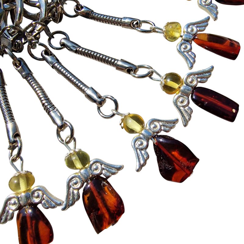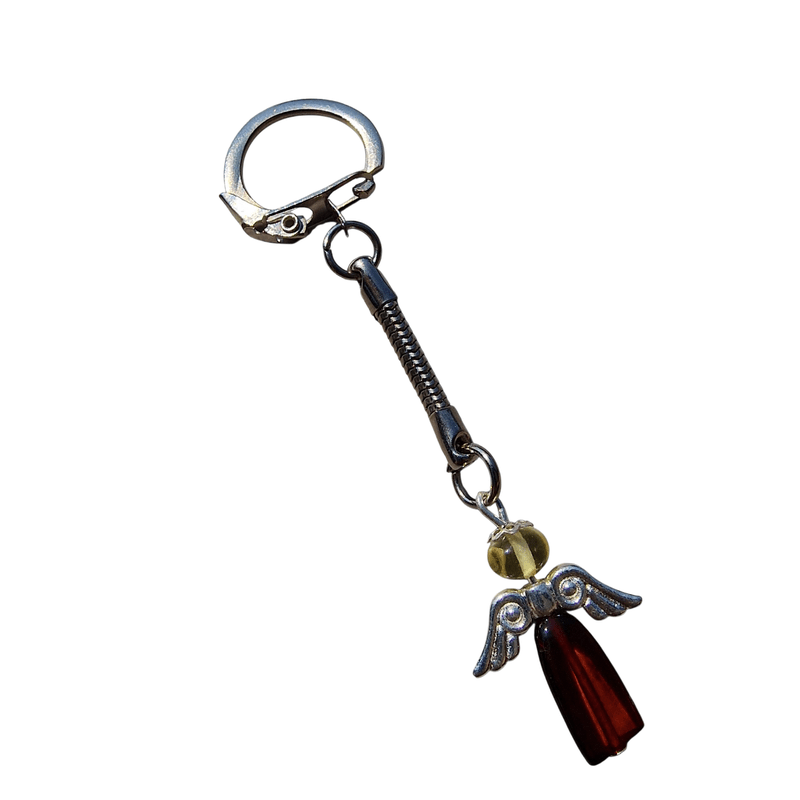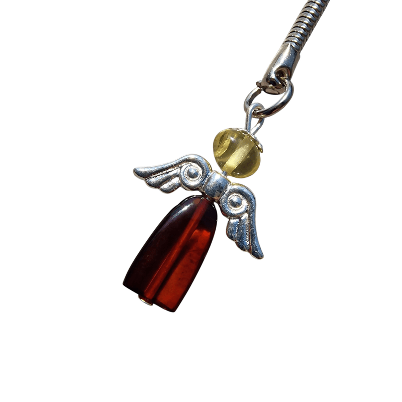 Különleges és jelentésteli borostyán angyal kulcstartó, amely egyszerre elegáns kiegészítő és spirituális védelmező. A valódi borostyán gyöngyök természetes szépsége időtálló harmóniát sugároz, míg az angyal szimbóluma a védelem, a szeretet és a béke üzenetét hordozza.