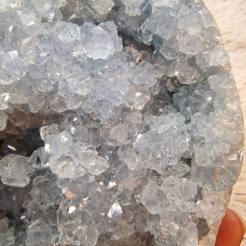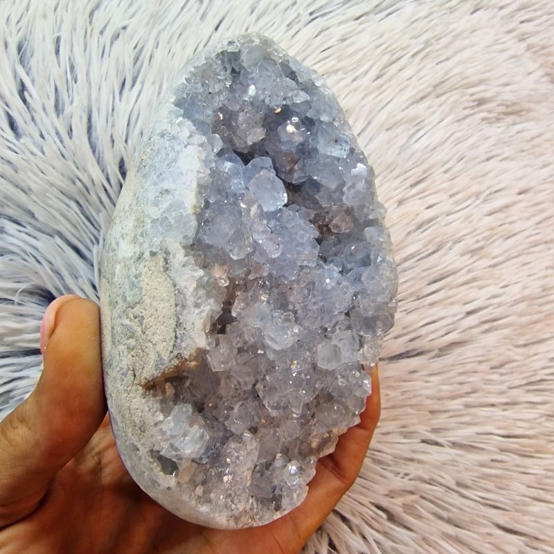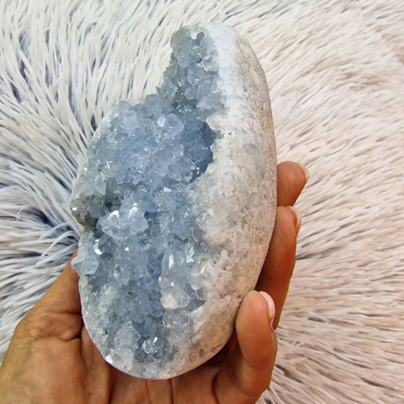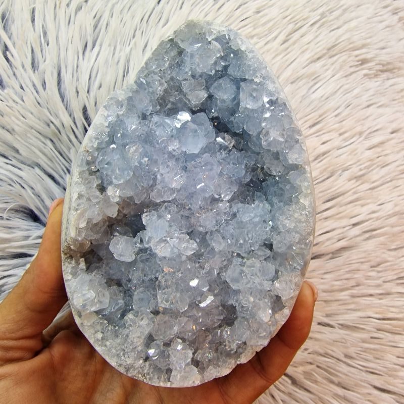 A tojás formára csiszolt külső természetes kőfelülete harmonikusan öleli körbe a belső, nyitott kristályüreget, ahol a finoman csillogó, világoskék–szürkés cölesztin kristályok természetes formájukban ragyognak. A kristályok kezeletlenek, megőrizték eredeti szerkezetüket és üveges fényüket, ami különösen elegáns, megnyugtató látványt nyújt.