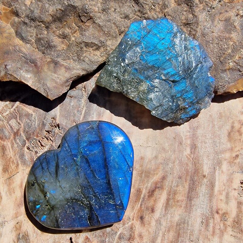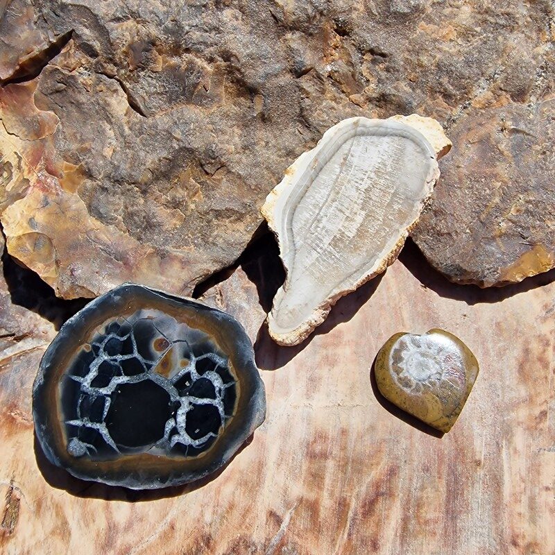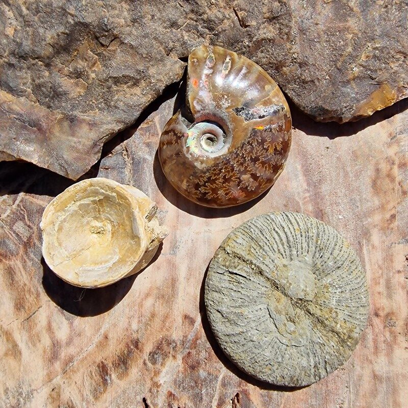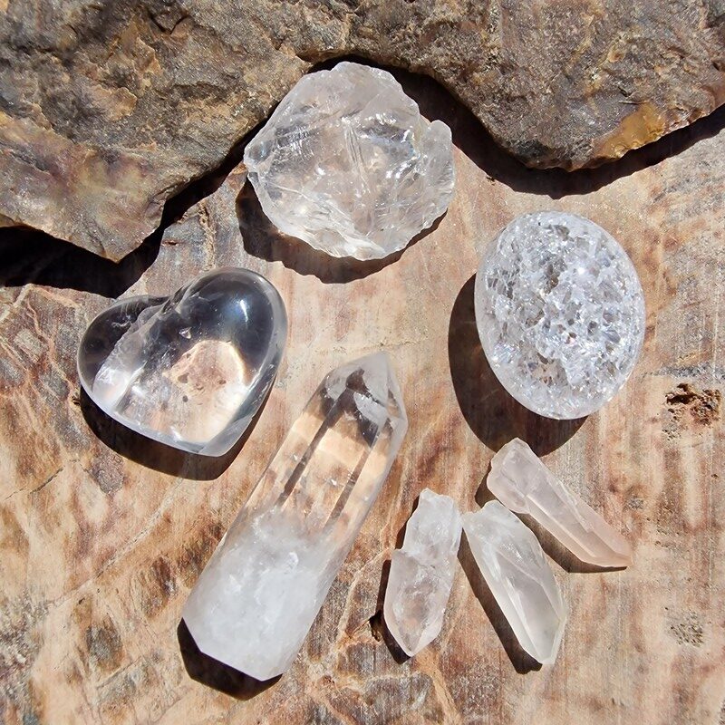 Rózsakvarc, ametiszt, hegyikristály, szelenit, amazonit, cölesztin, achát, vanadinit, ammonitesz, szeptária, megkövesedett fa, ásványokból. Marokkóból , Kínából és Madagaszkárról származnak.