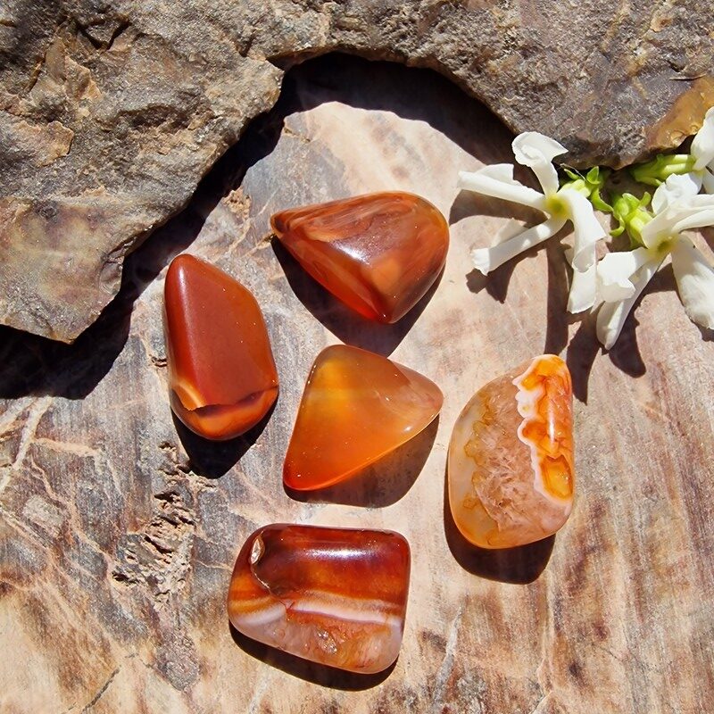 Karneol, aragonit, vörös hematoid kvarc, vanadinit ásványokból. Marokkóból és Madagaszkárról származnak.
