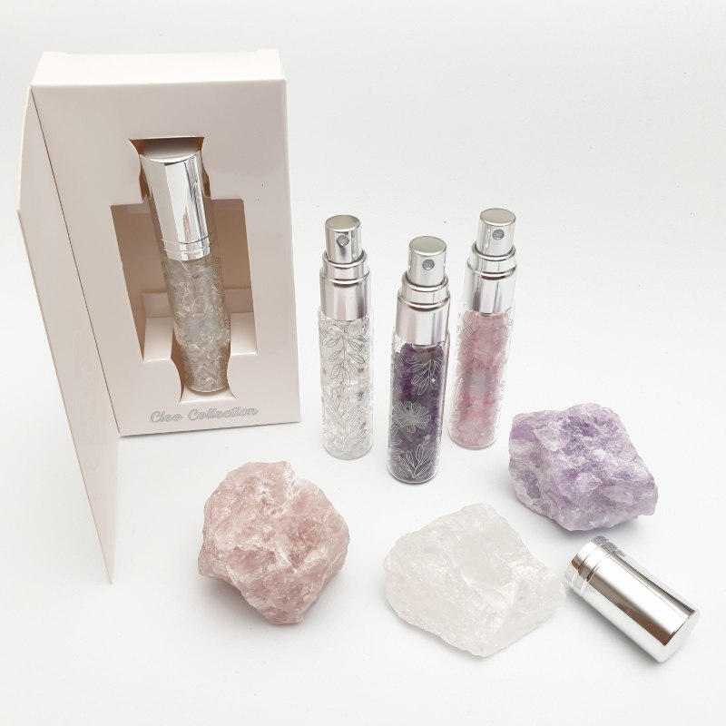 Hegyikristály ásvány elixír spray. Üvegből és mikroszórófejes spray fújókával a maximális kényeztetés érzése érdekében, díszcsomagolásban.