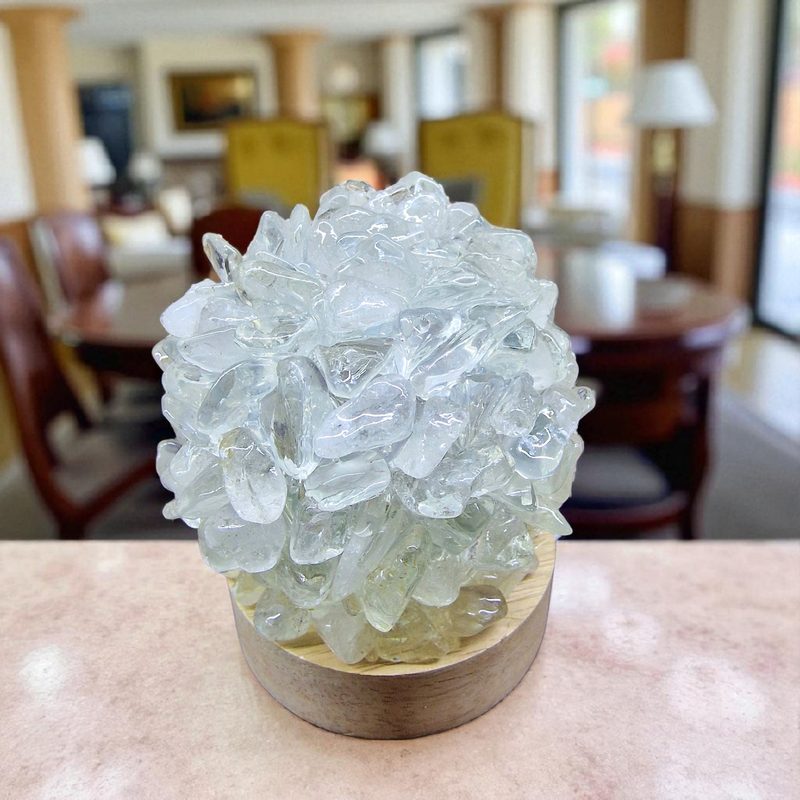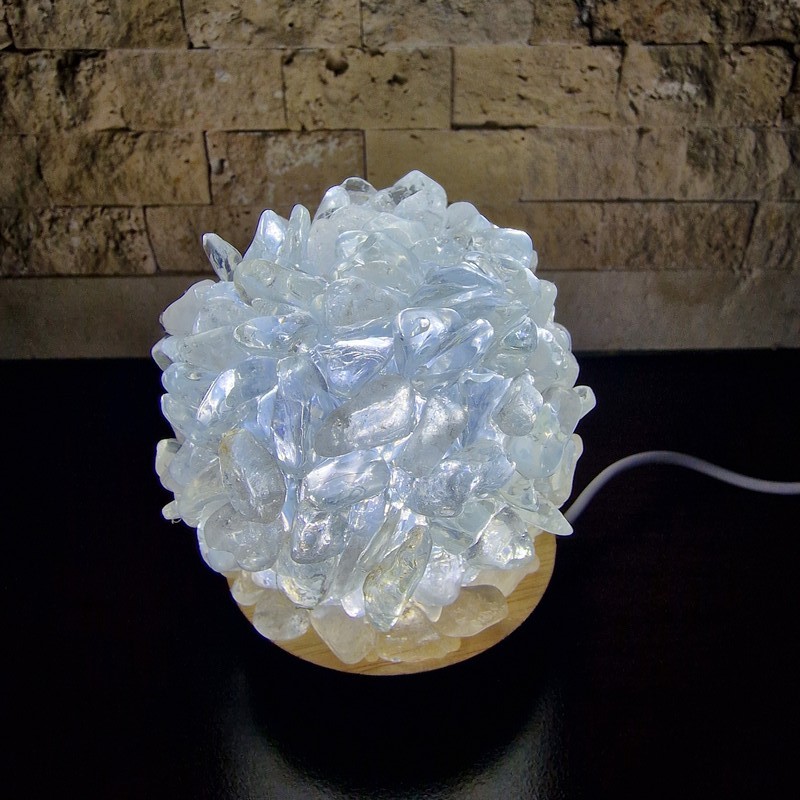 Ez az elegáns hegyikristály ásvány lámpa 12 cm, gömb formájú, melyet egy 2 cm magas, természetes fa LED talp tart. A lámpa fénye gyönyörűen átsugárzik a tiszta kristályon, harmonikus és nyugtató hangulatot teremtve otthonodban.