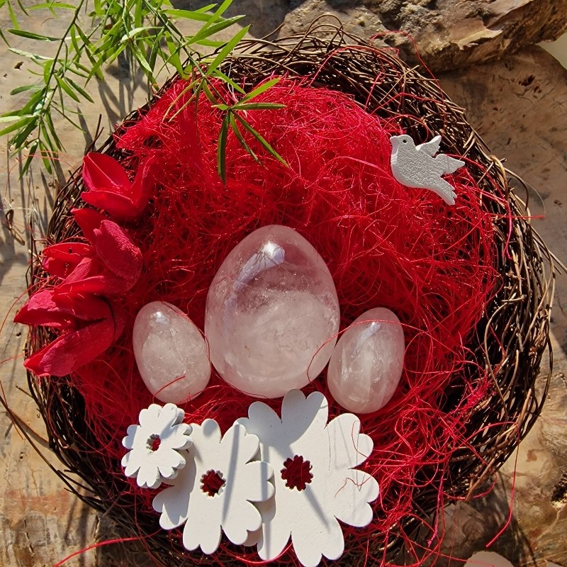 Hegyikristály ásvány tojások , 15 cm-es kosárkában, díszítéssel.