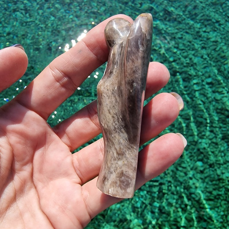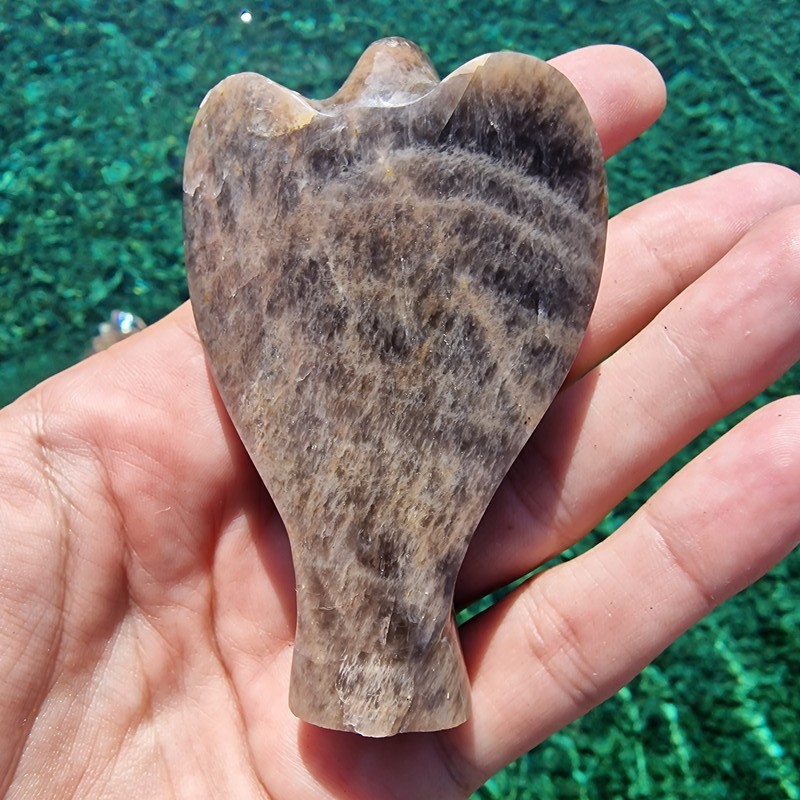 Fekete holdkő ásványból faragott angyal, Madagaszkárról. Termék megtekinthető videón Instagram oldalunkon.
