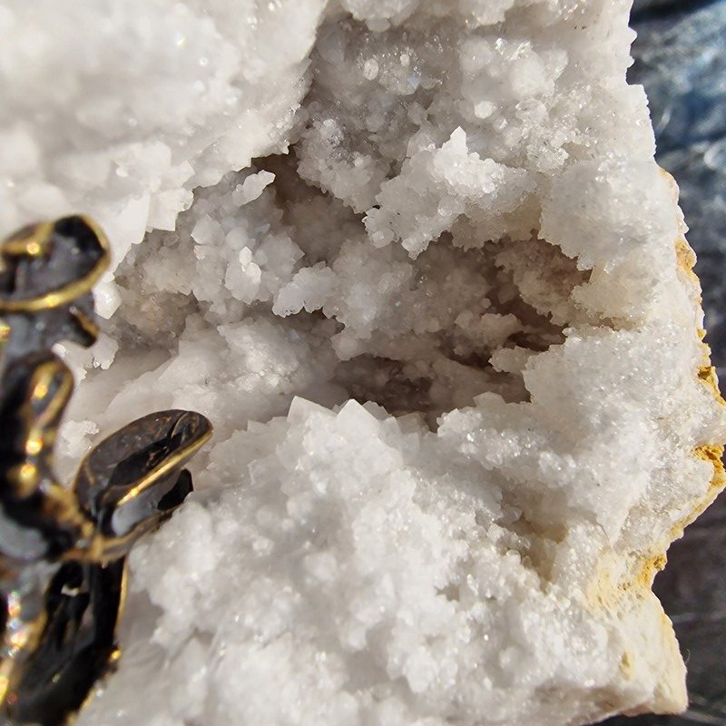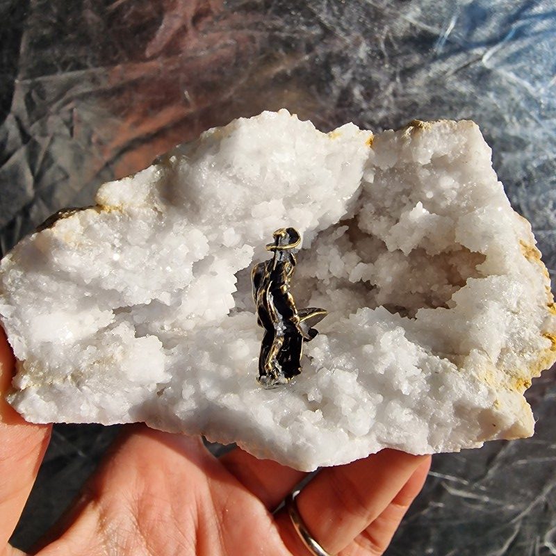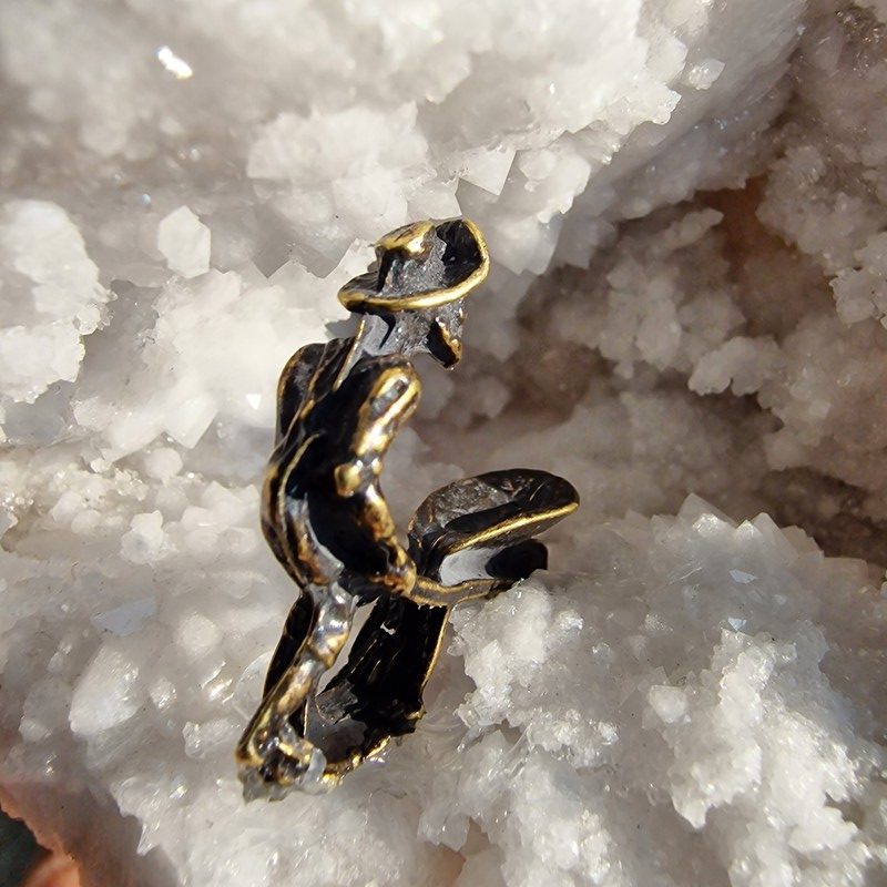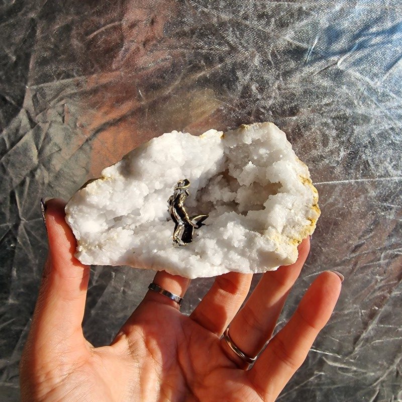 Kvarc geóda, bányász szobrocskával. Gyönyörűen kikristályosodott darab.
