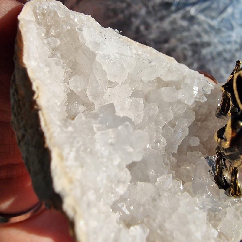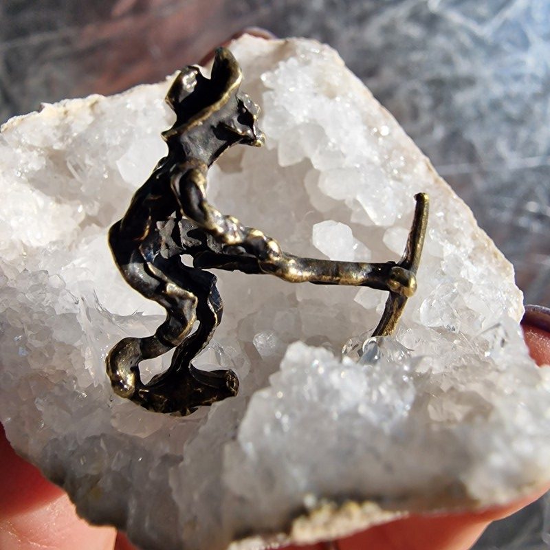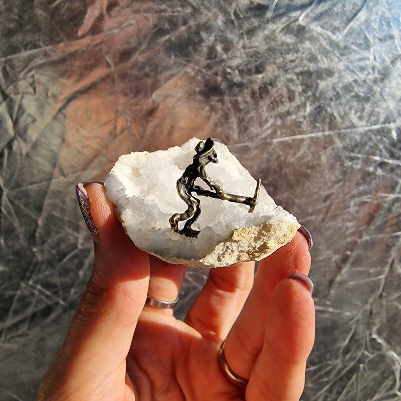 Kvarc geóda, bányász szobrocskával. Gyönyörűen kikristályosodott darab.