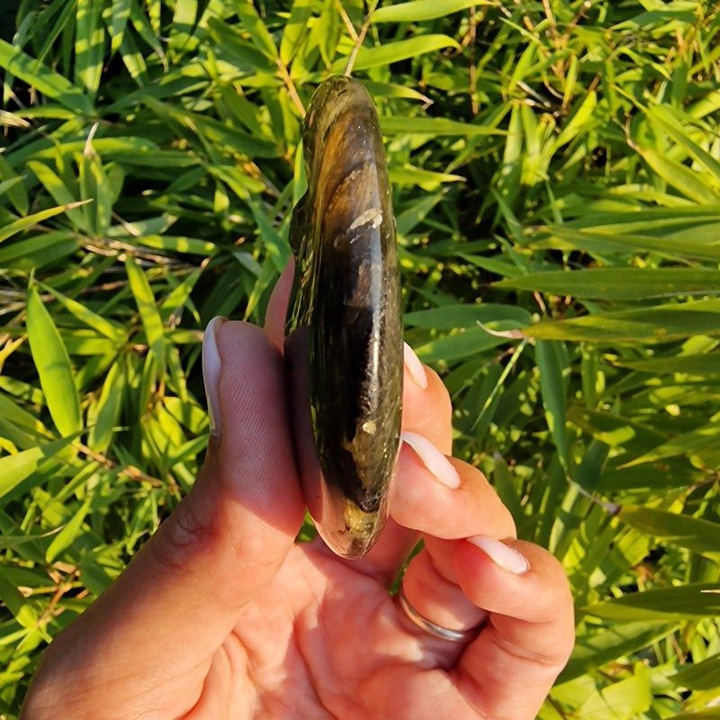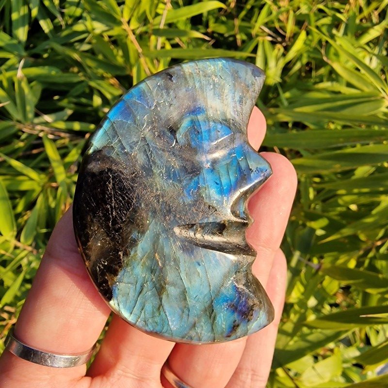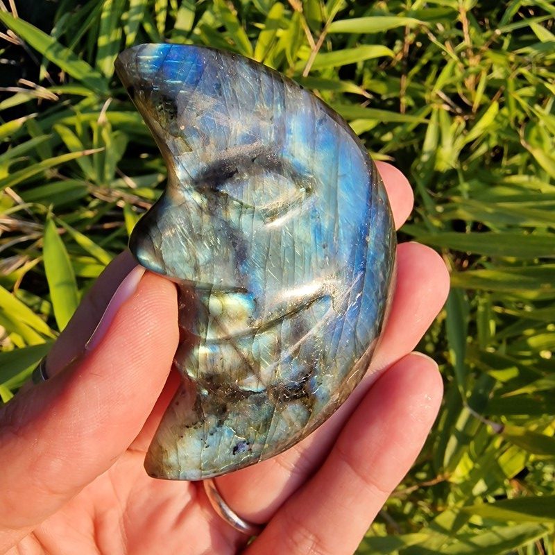 Labradorit ásványból faragott félhold, Madagaszkárról.