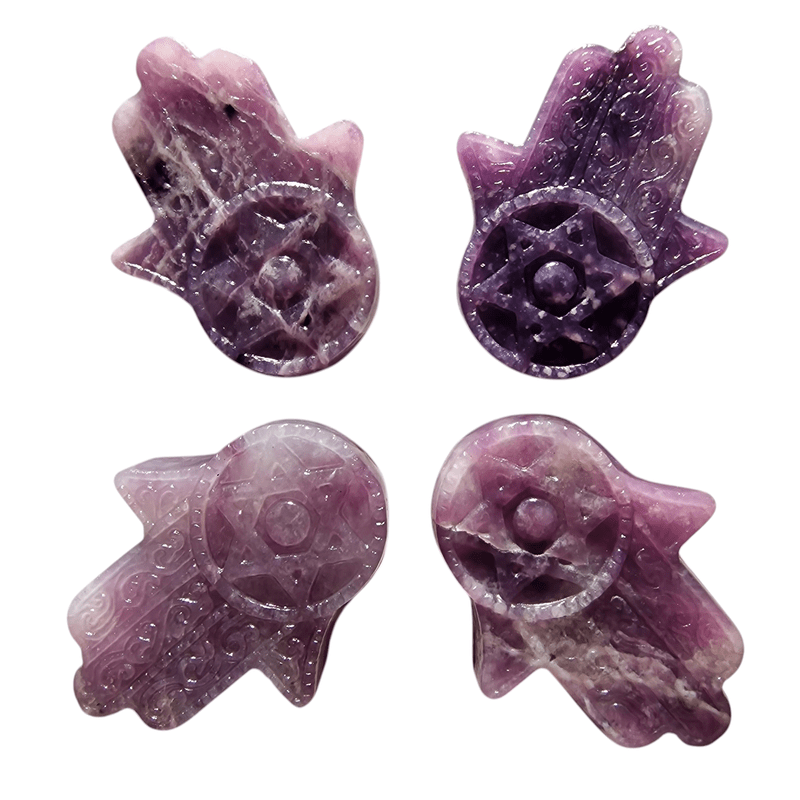 Lepidolit ásványból készített védelmező fatima keze faragvány.