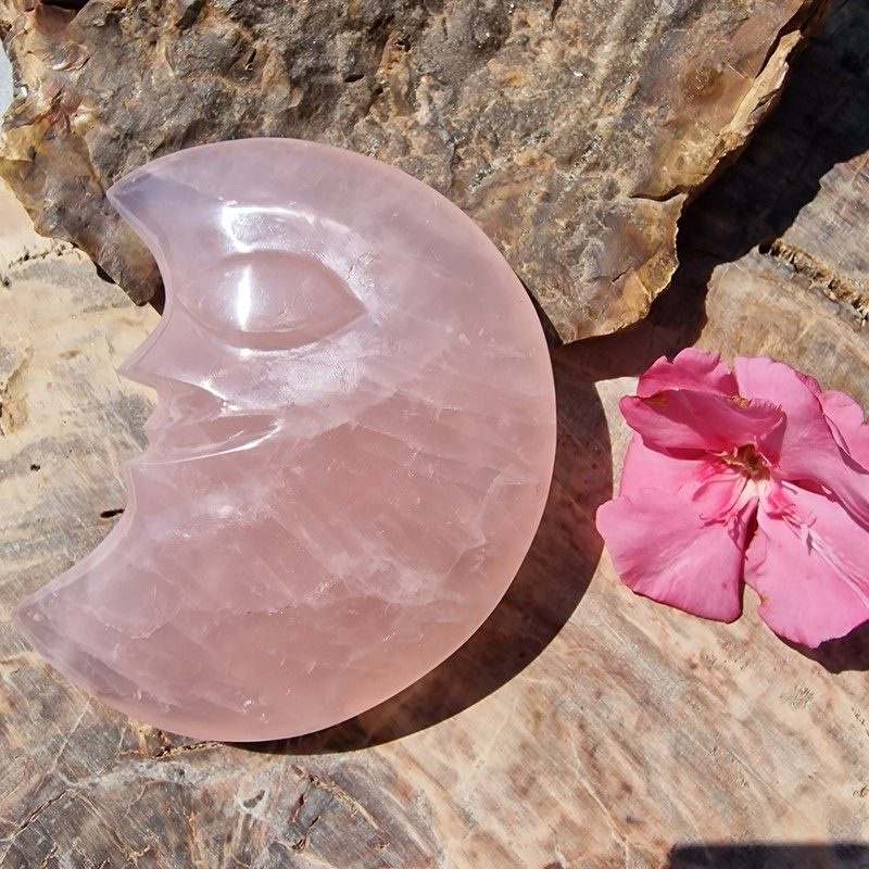 Rózsakvarc ásványból faragott félhold, Madagaszkárról.