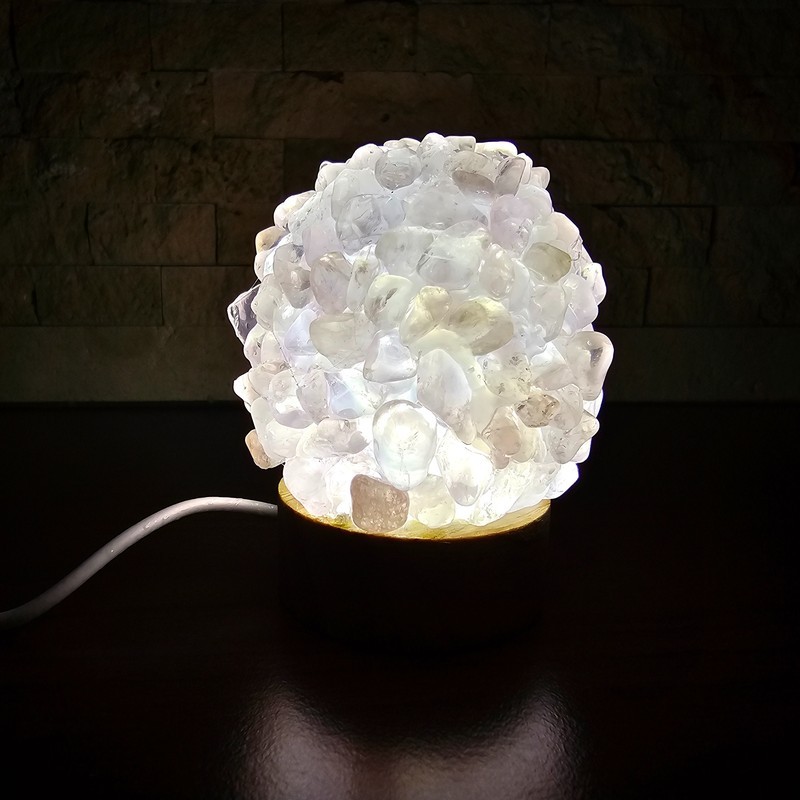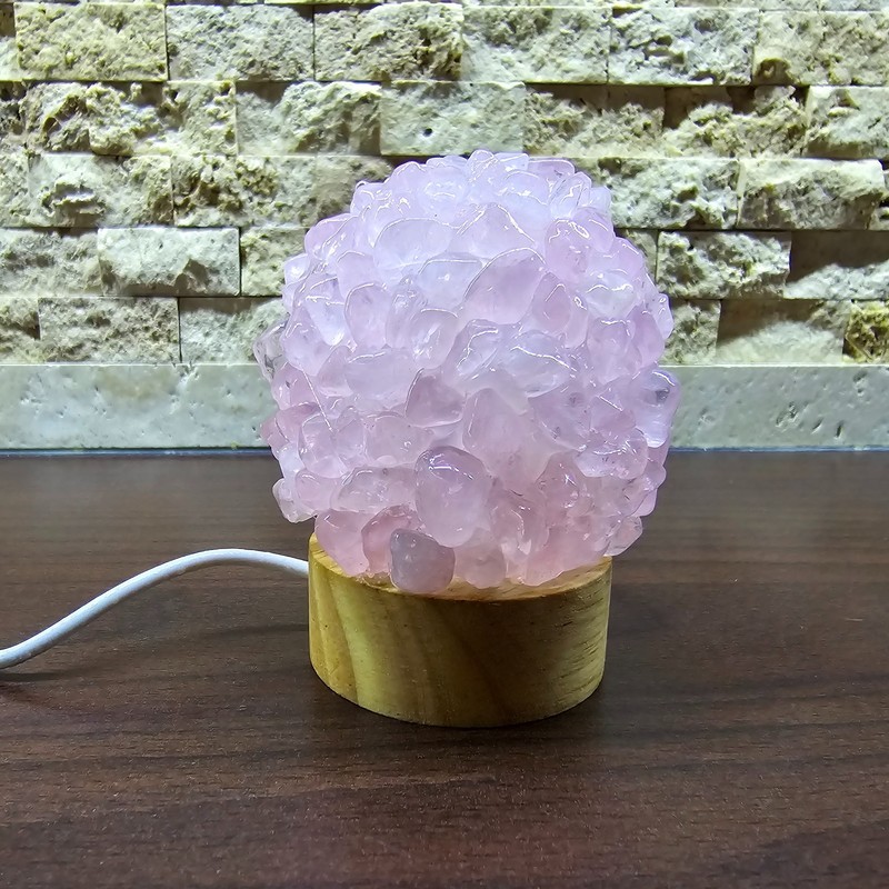 Ez az egyedi rózsakvarc ásvány lámpa gömb formájú, 9 cm, melynek alapját egy 2 cm magas fa LED világítás adja. A lámpa lágy, meleg fénye kiemeli a rózsakvarc természetes mintázatát, így különleges hangulatvilágítást teremt otthonodban.
