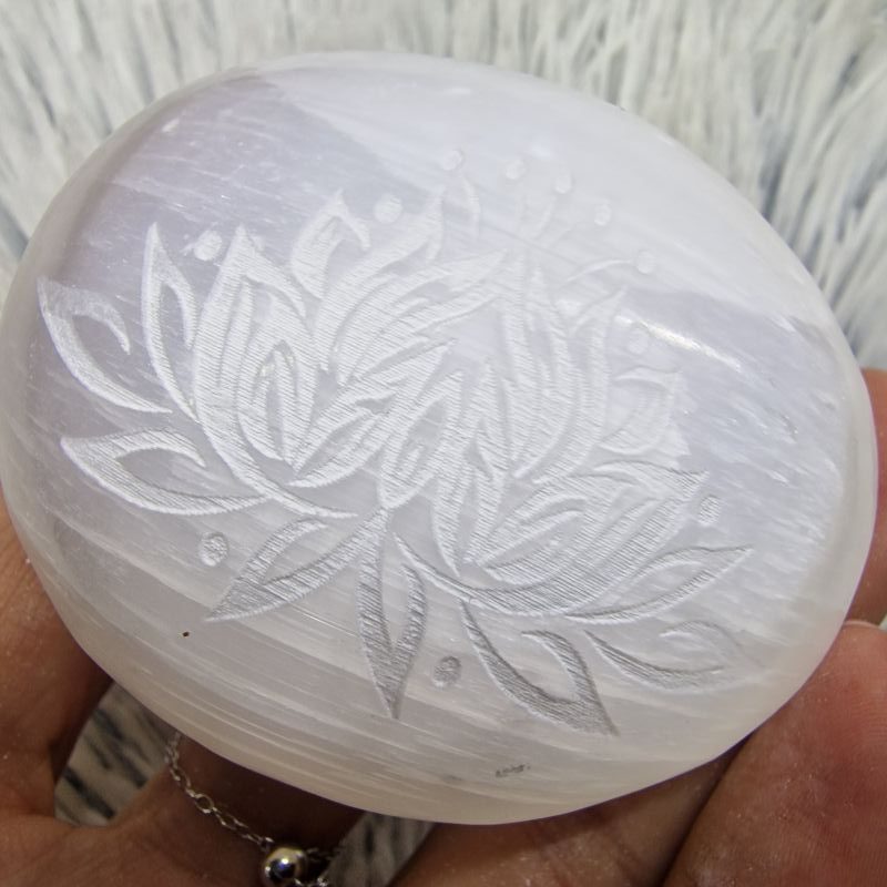 Ez az elegáns szelenit ásvány marokkő Marokkóból származik, finoman csiszolt, ovális formáját pedig részletgazdag lótuszvirág gravírozás díszíti. A lótusz a tisztaság, az újjászületés, a belső béke és a spirituális fejlődés ősi szimbóluma, amely tökéletesen illeszkedik a szelenit letisztult, magas rezgésű energiájához.