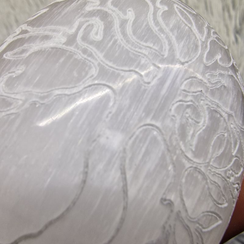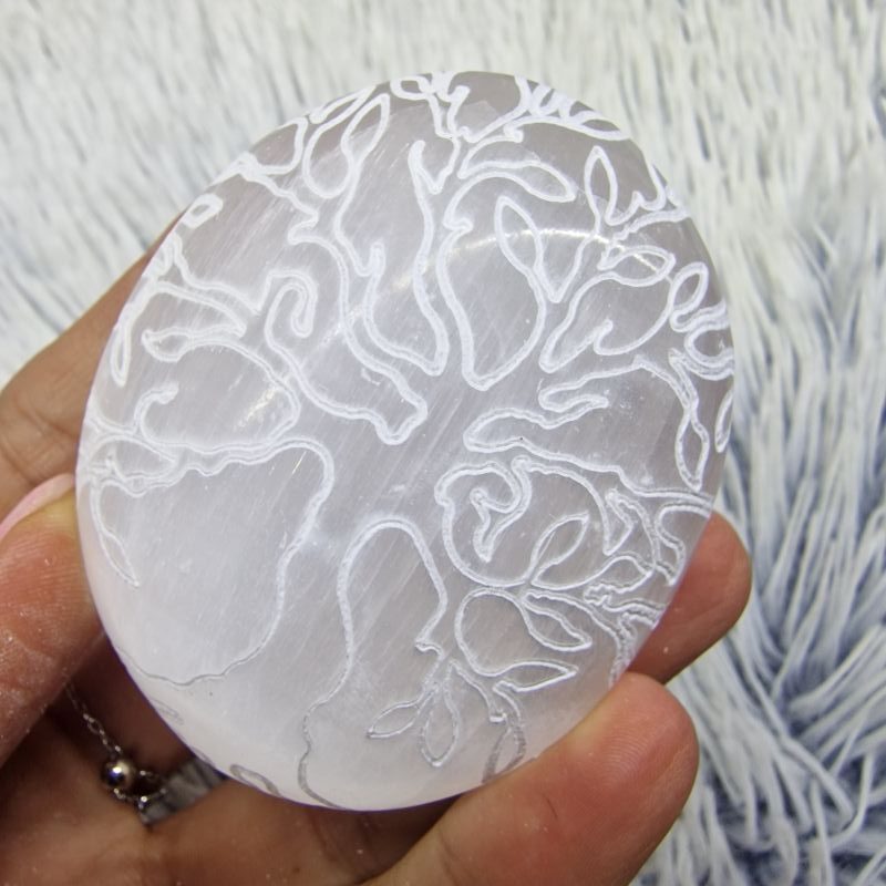 Ez a különleges szelenit ásvány marokkő Marokkóból származik, és finoman csiszolt, ovális formáját részletgazdag életfa gravírozás díszíti. Az életfa az erő, a növekedés, az egyensúly és az összekapcsolódás ősi szimbóluma, amely tökéletes összhangban áll a szelenit tiszta, nyugtató energiájával.