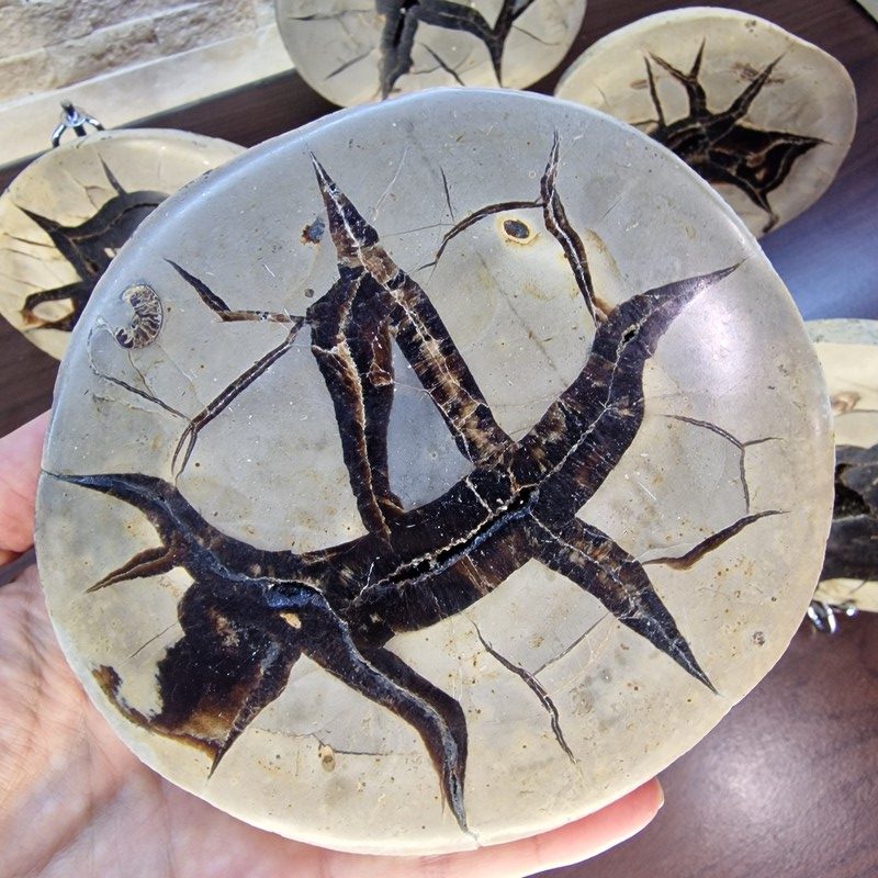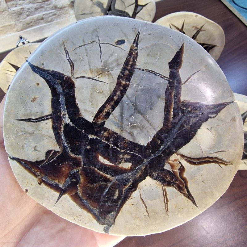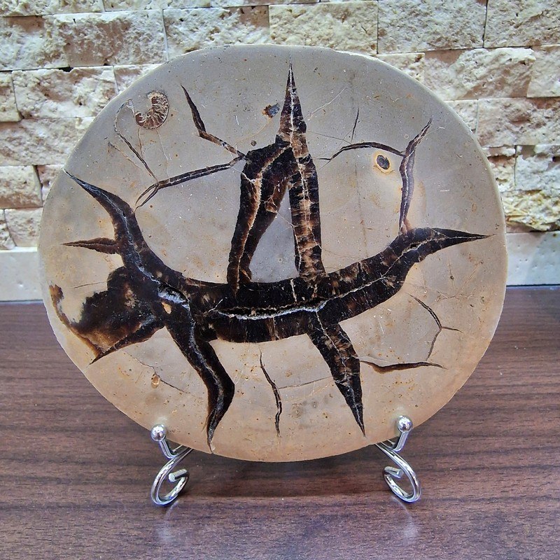 Fedezd fel a természet egyik legkülönlegesebb kincsét: ez a Madagaszkárról származó szeptária fosszília valódi geológiai ritkaság! A szeptáriák különleges szerkezete több millió év alatt alakult ki, repedéseit természetes ásványi anyagok – például kalcit, aragonit vagy barit – töltötték ki, így látványos "csillagszerű" mintázatot hozva létre.