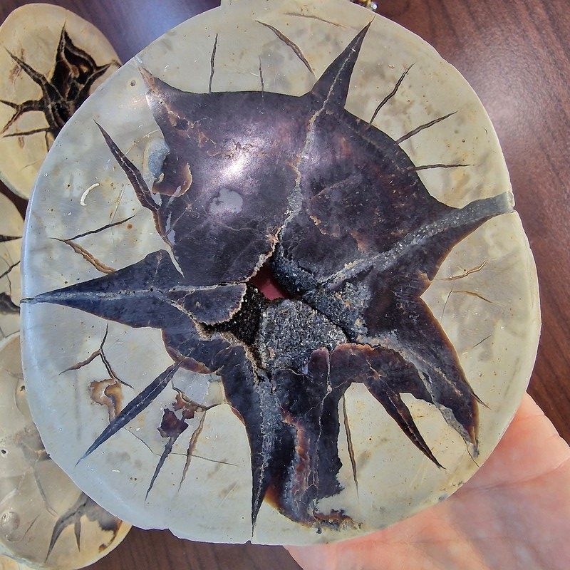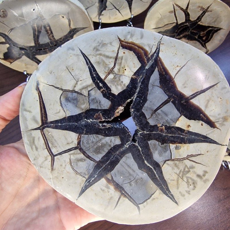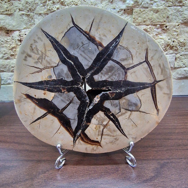 Fedezd fel a természet egyik legkülönlegesebb kincsét: ez a Madagaszkárról származó szeptária fosszília valódi geológiai ritkaság! A szeptáriák különleges szerkezete több millió év alatt alakult ki, repedéseit természetes ásványi anyagok – például kalcit, aragonit vagy barit – töltötték ki, így látványos "csillagszerű" mintázatot hozva létre.