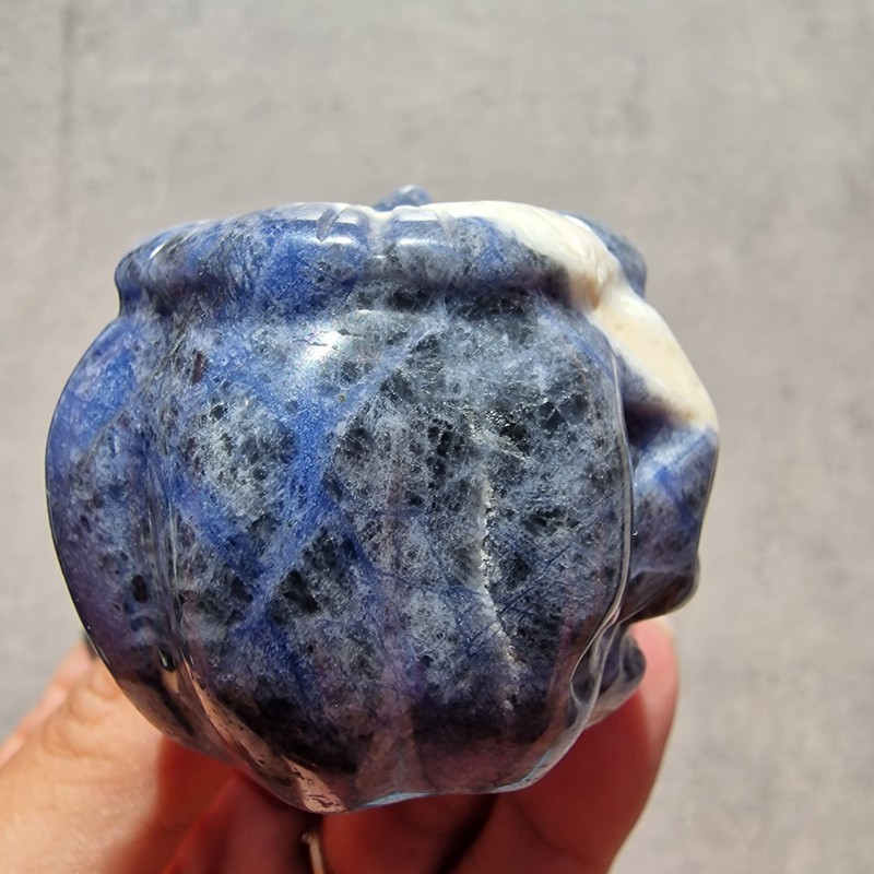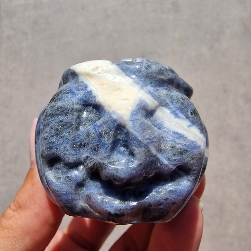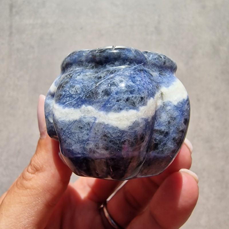 Ez a különleges, kézzel faragott szodalit ásvány tök a harmónia, belső béke és önkifejezés szimbóluma. A mélykék és fehér erezetű szodalit nyugodt energiát áraszt, segíti a koncentrációt és a tiszta gondolkodást, így ideális választás mindennapi inspirációnak vagy őszi dekorációnak.