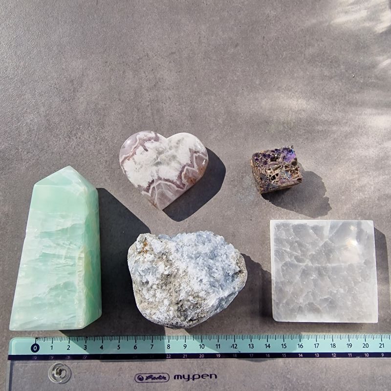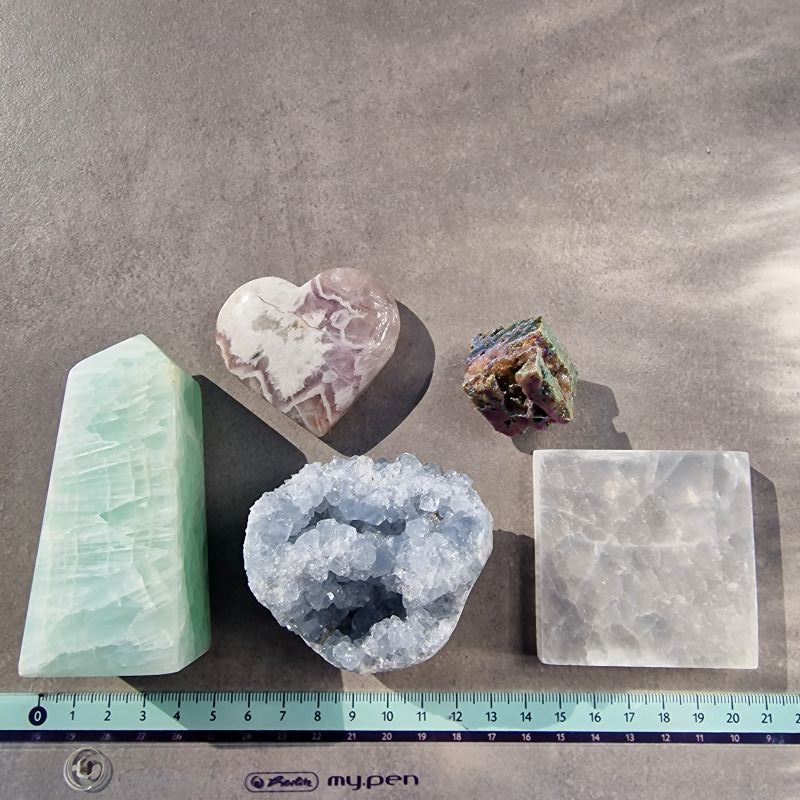 Ez az 5 darabos, többféle ásványból álló csomag gondosan összeválogatott darabokat tartalmaz, amelyek színben, rajzolatban és megjelenésben is szépen kiegészítik egymást. Ideális választás, ha egyszerre több ásványt szeretnél kézbe venni, gyűjteni, lakásdekorációként használni, vagy ajándékba adni.